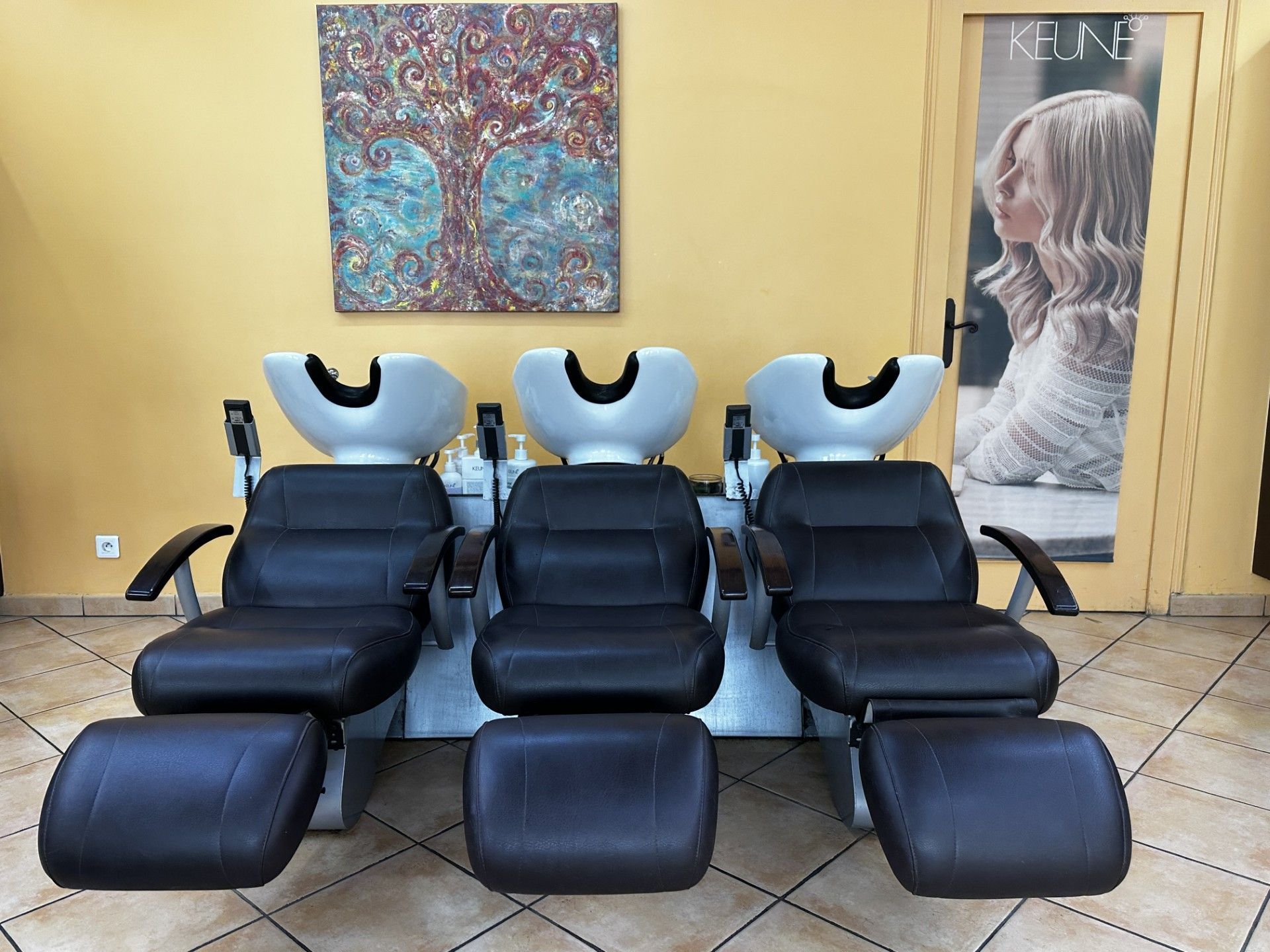Salon de coiffure avec fauteuils de coiffure et bacs à shampoing